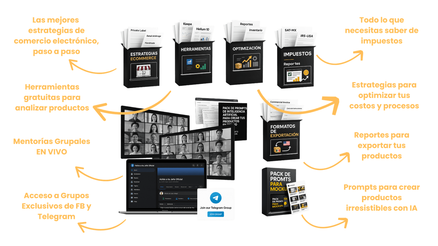 Consiste en una serie de videos en donde aprenderás, paso a paso, cómo vender en Amazon Estados Unidos, México y otros países. Obtendrás, además, todos los bonos mencionados en esta página, como por ejemplo, el acceso a los grupos de Facebook y Telegram exclusivos para alumnos, en donde resolveremos cualquier duda que tengas de manera personalizada.