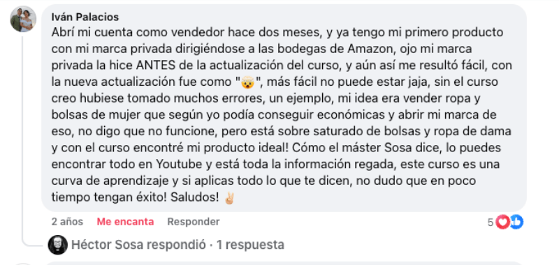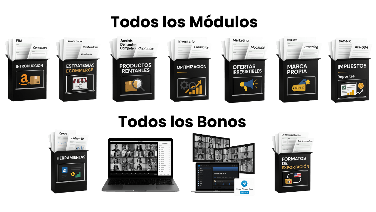 Consiste en una serie de videos en donde aprenderás, paso a paso, cómo vender en Amazon Estados Unidos, México y otros países. Obtendrás, además, todos los bonos mencionados en esta página, como por ejemplo, el acceso a los grupos de Facebook y Telegram exclusivos para alumnos, en donde resolveremos cualquier duda que tengas de manera personalizada.